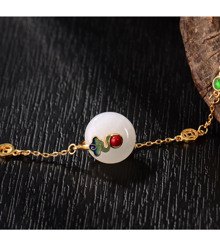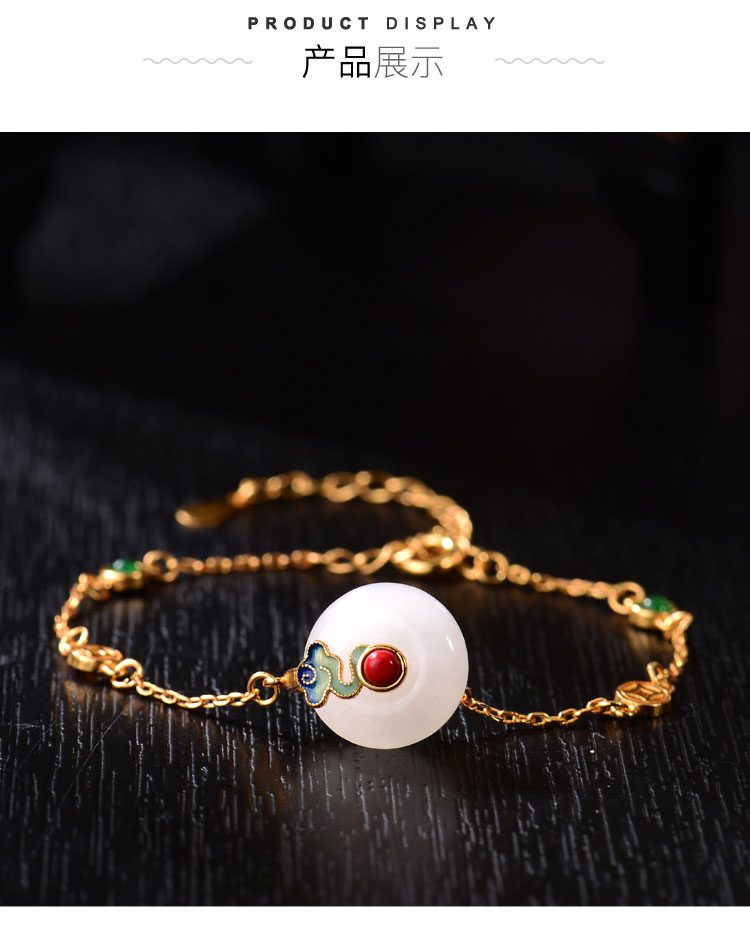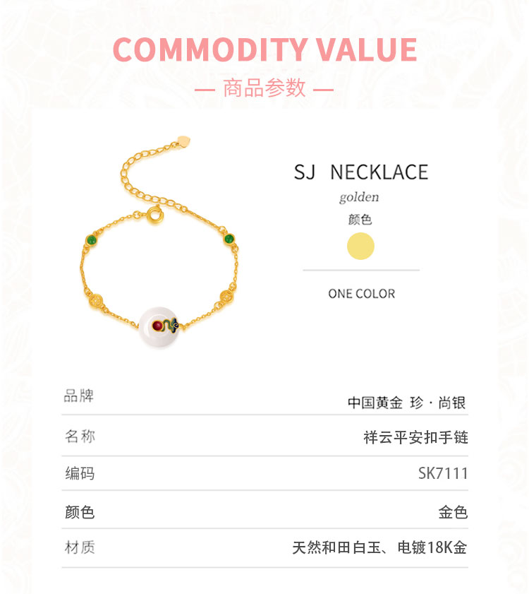 商品名称:中国黄金 天然和田白玉珐琅<祥云>平安扣手链SK7111
