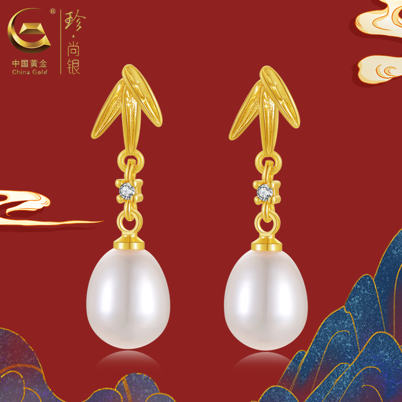 中国黄金 天然淡水珍珠<竹月影>竹叶耳环--SK7223