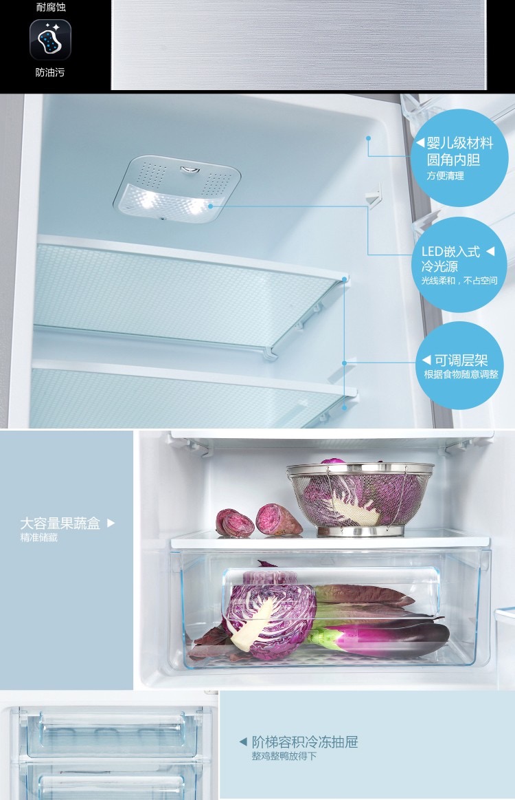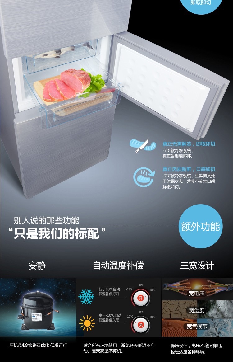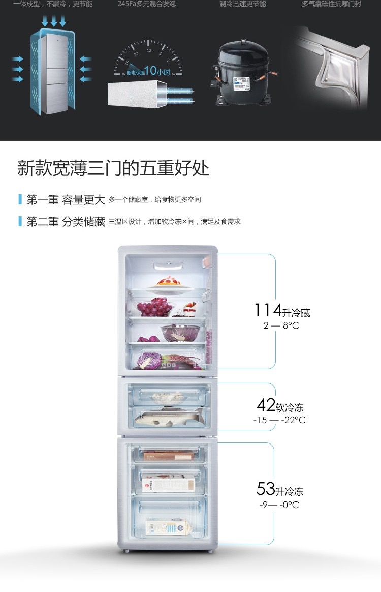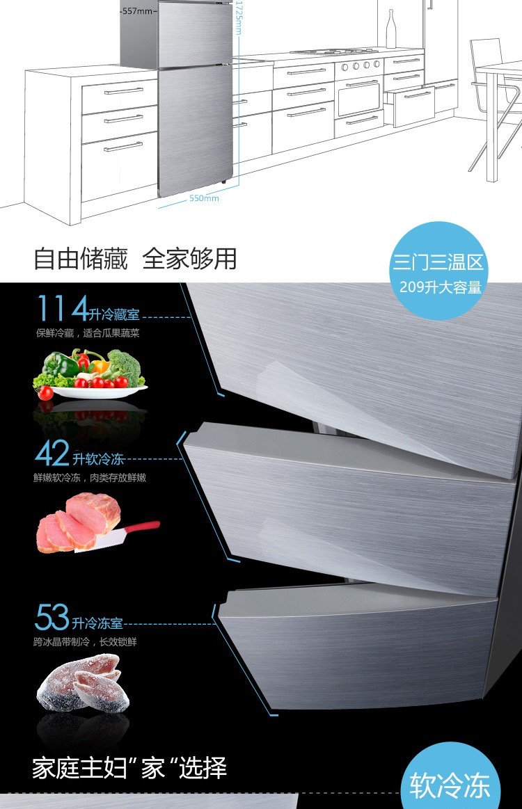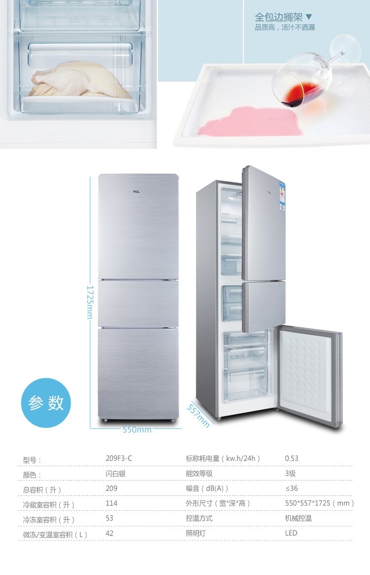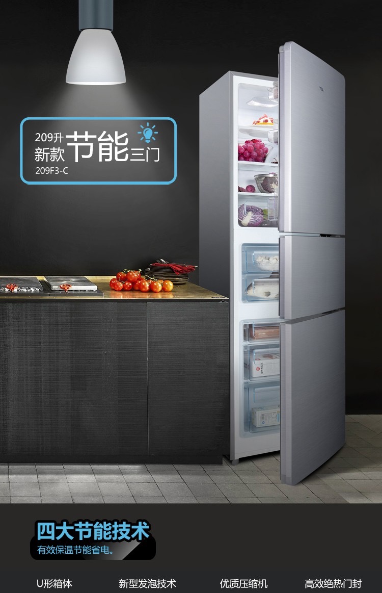商品名称:TCL 209L容量 强劲冷冻力 三门三温区(闪白银)209F3-C 闪白银