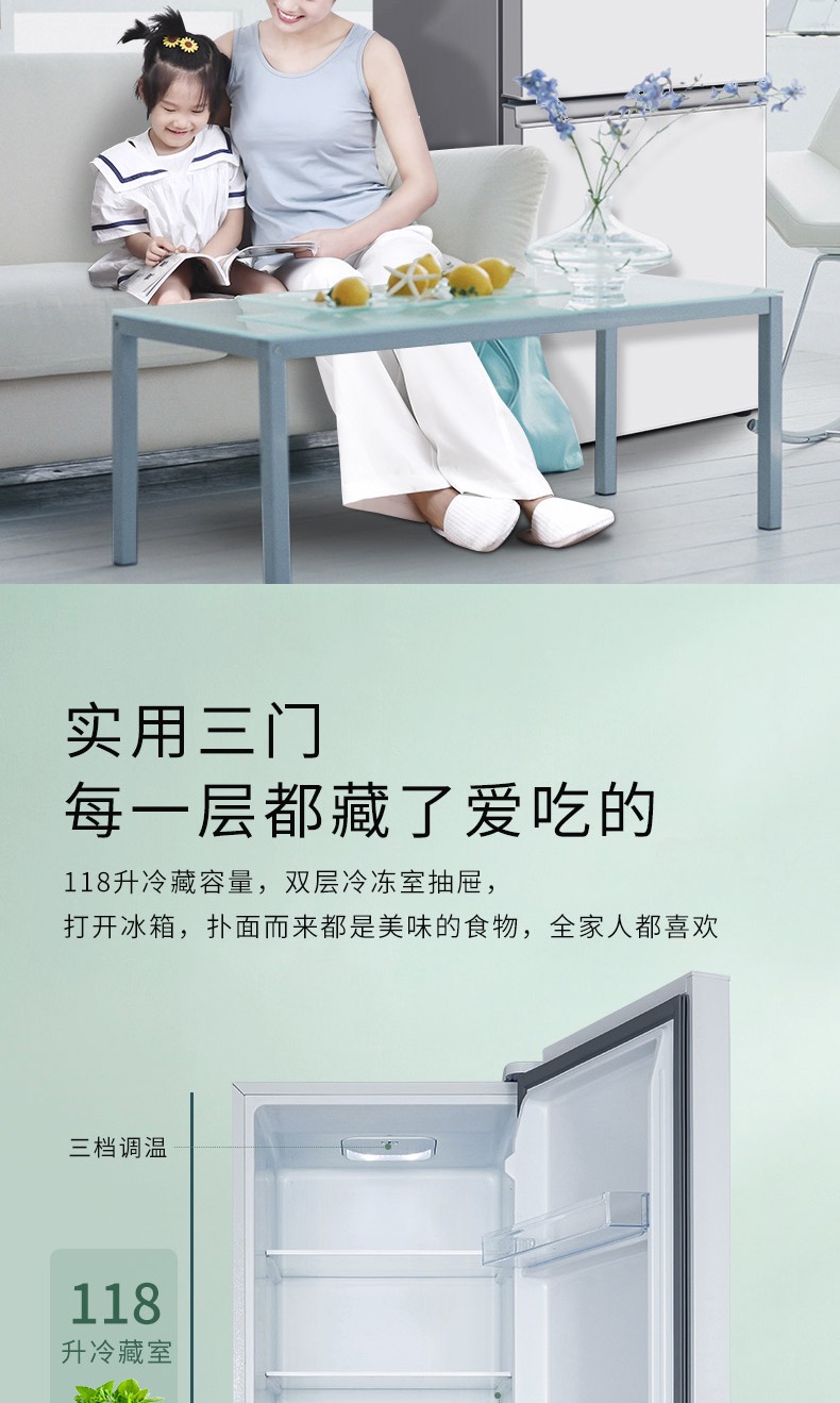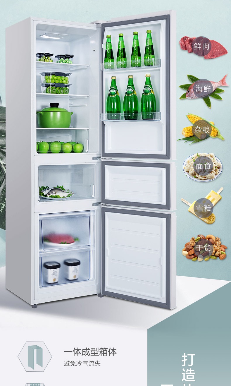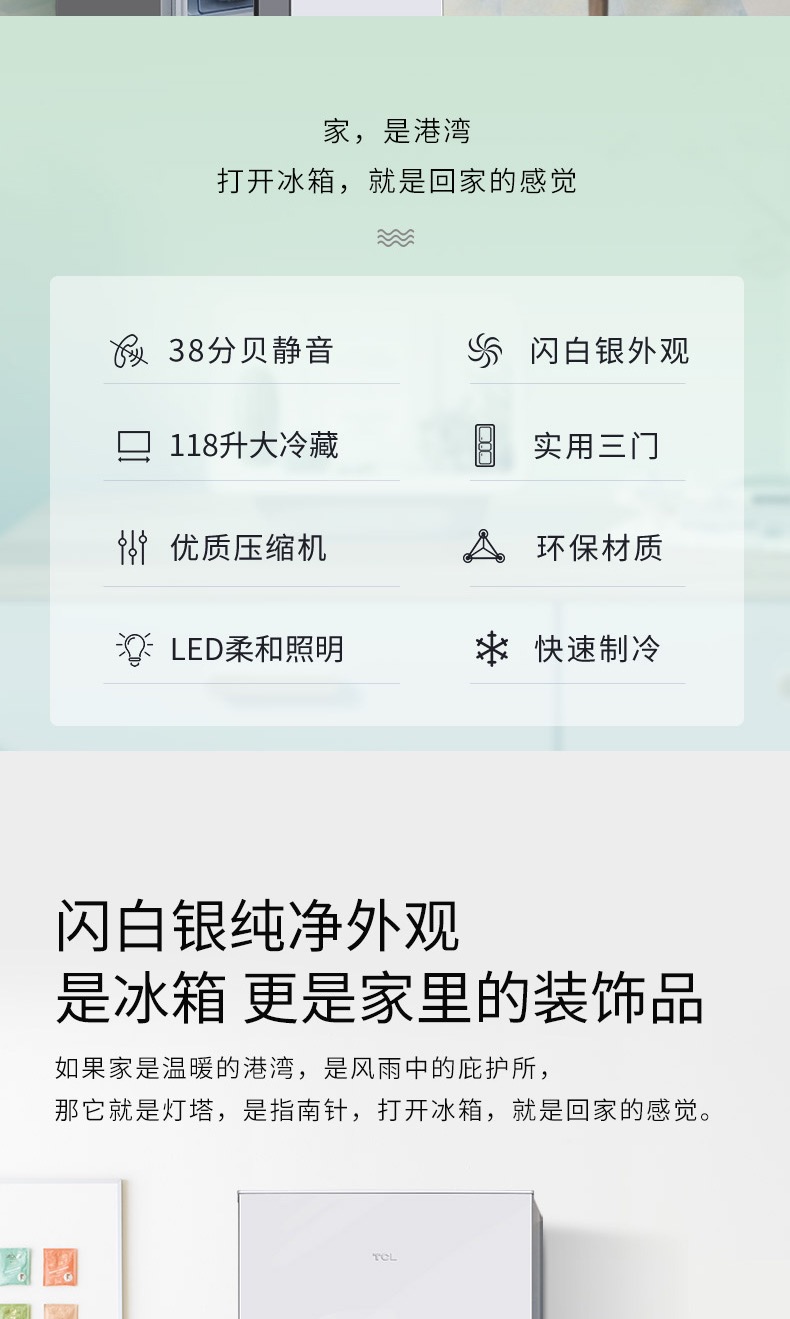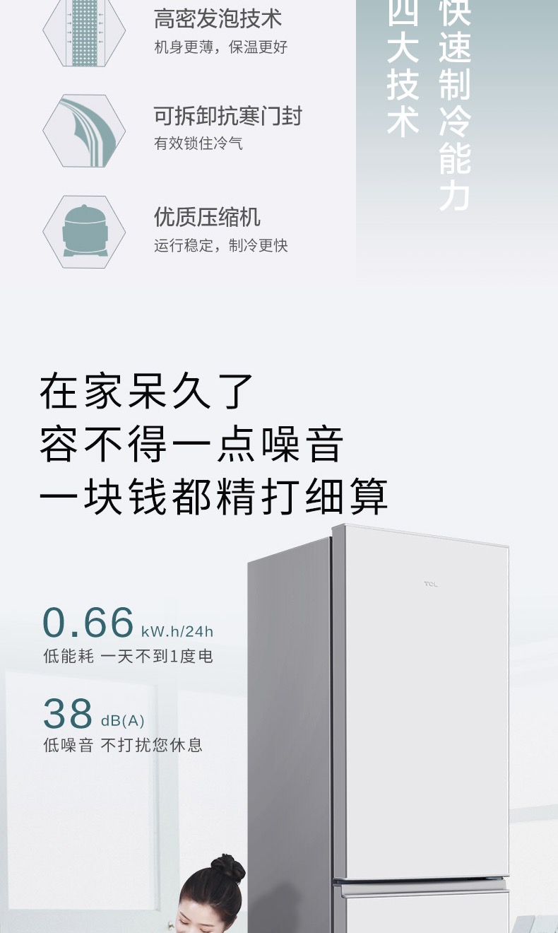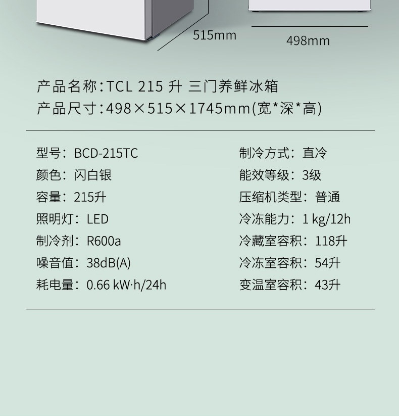 商品名称:TCL 215升三门 直冷微霜 节能静音 中门软冷冻 即切即用 BCD-215TC 闪白银(新)