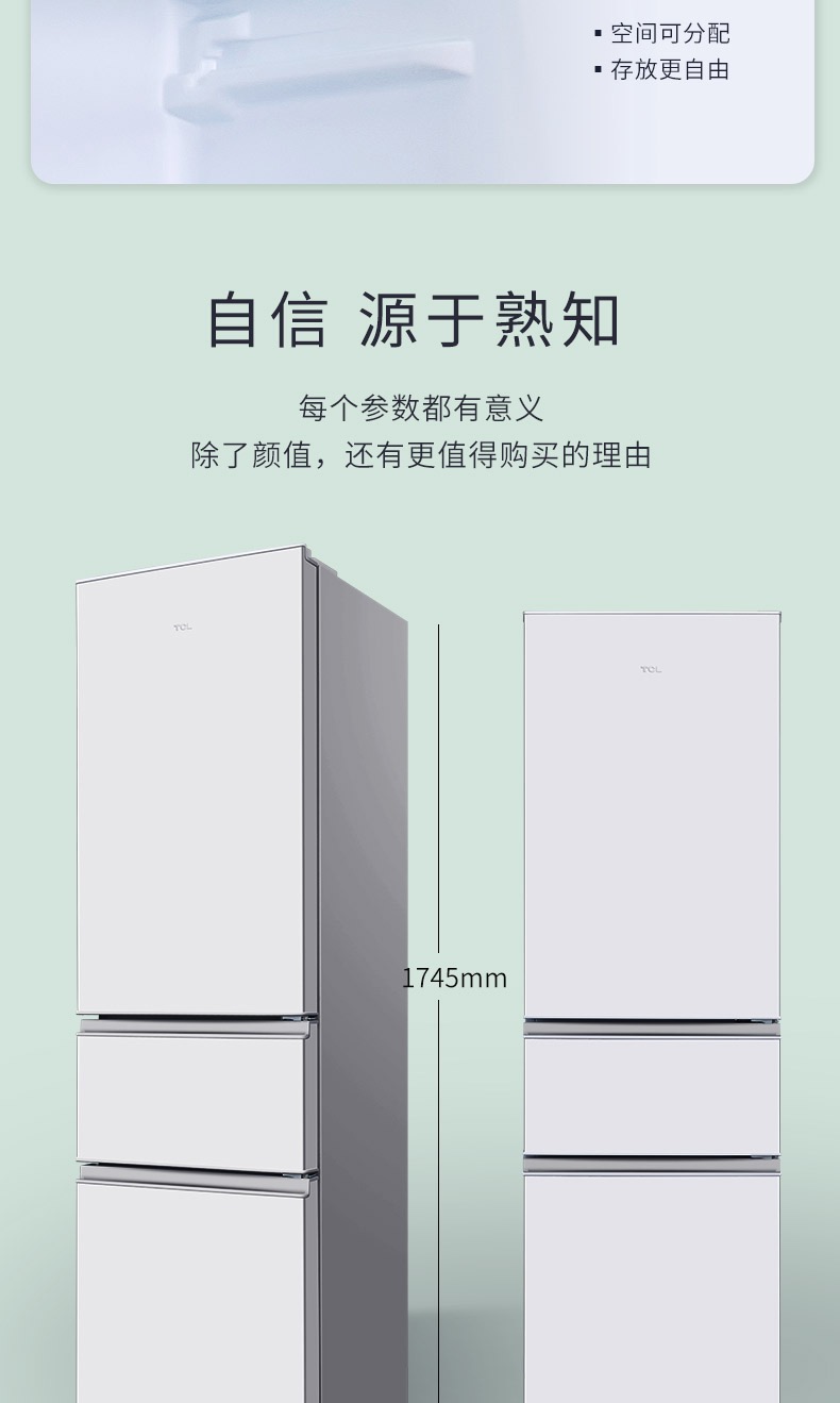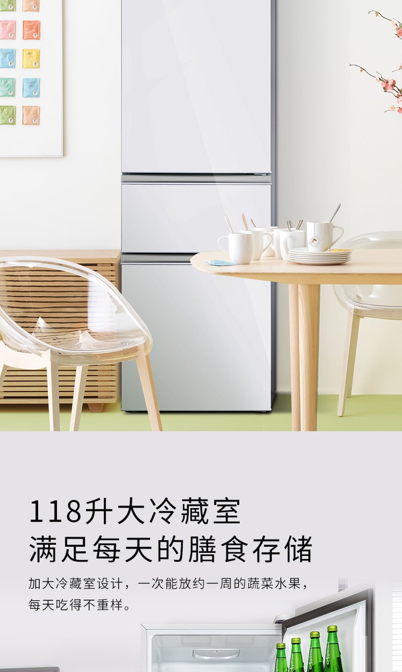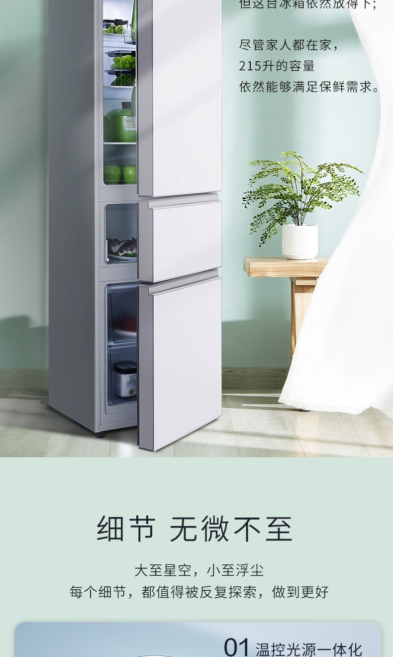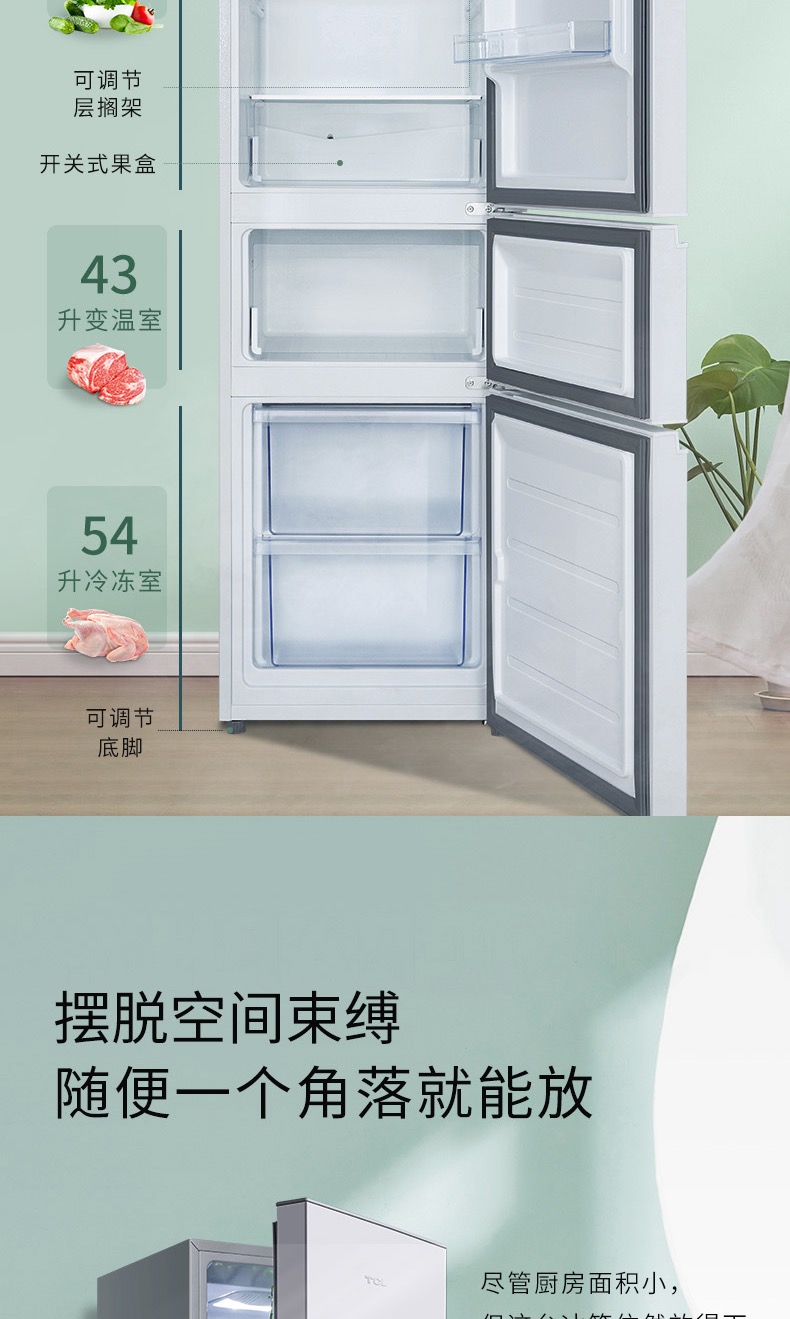 TCL 215升三门 直冷微霜 节能静音 中门软冷冻 即切即用 BCD-215TC 闪白银(新)