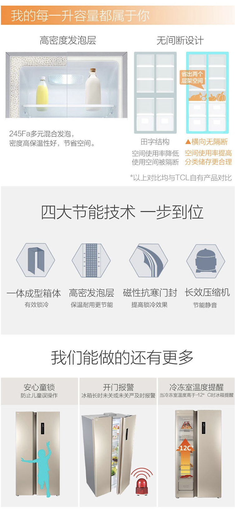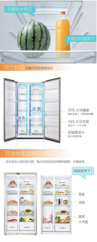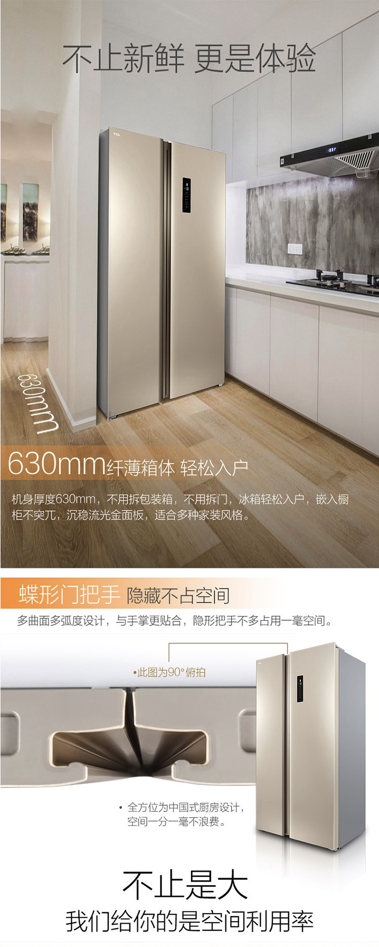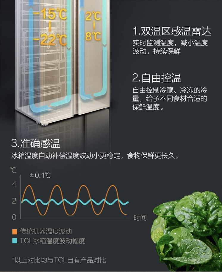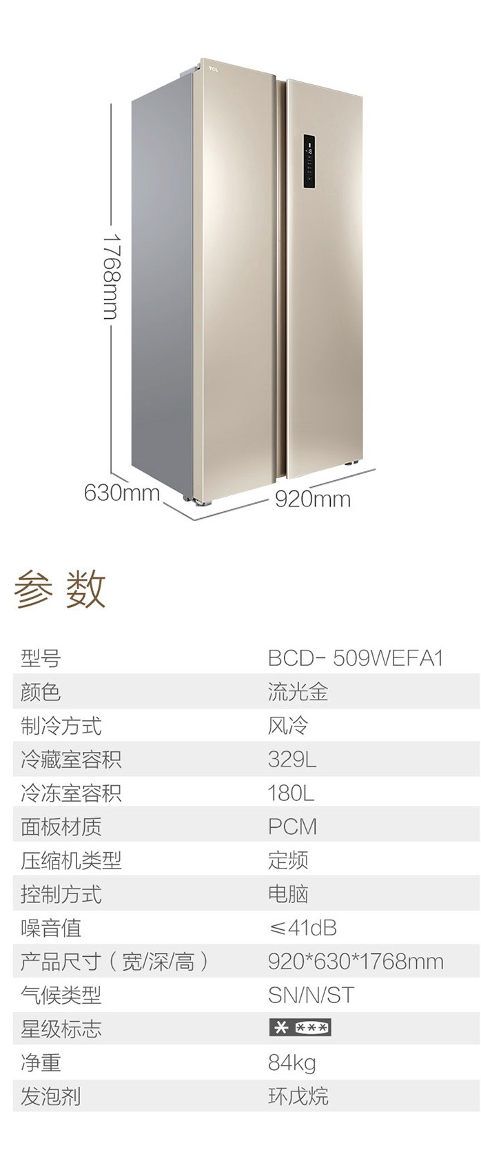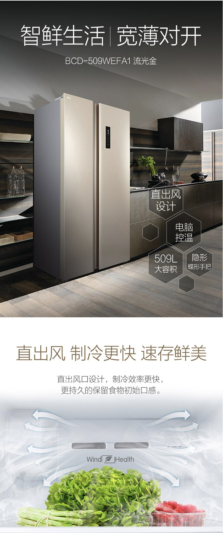 商品名称:TCL 509升 风冷无霜 电脑温控 对开门冰箱 智慧出风 纤薄 BCD-509WEFA1流光金