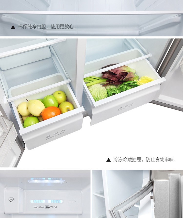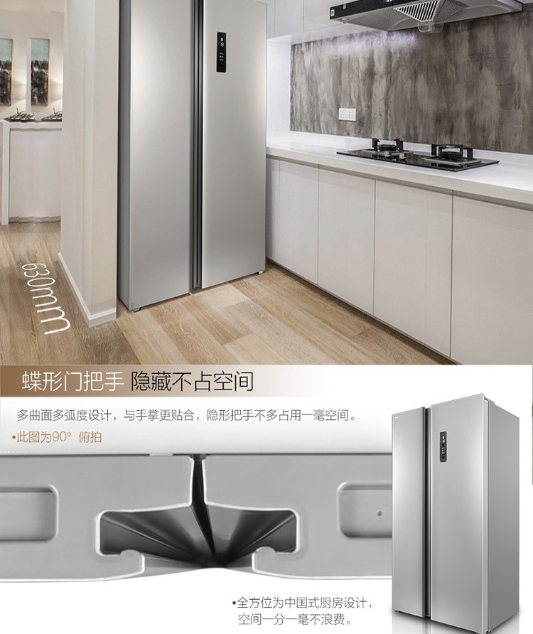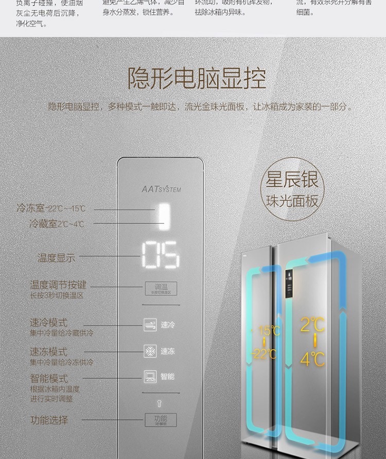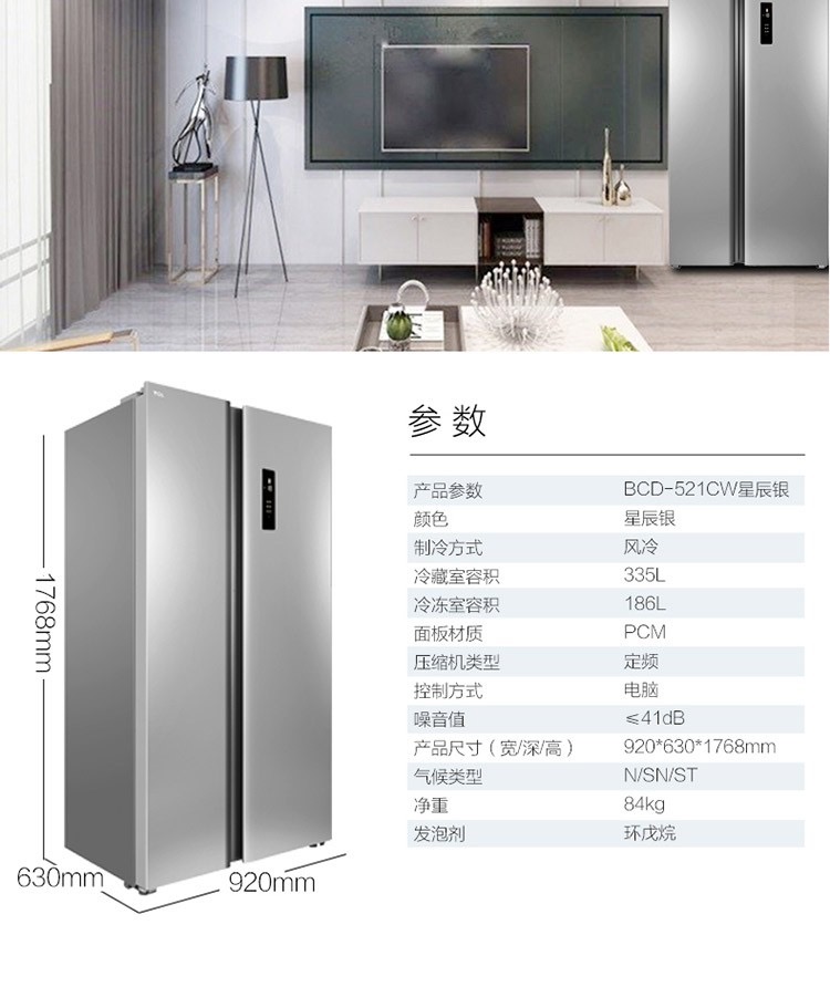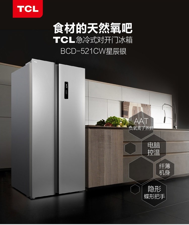 商品名称:TCL 521升对开门冰箱 风冷无霜 AAT负离子养鲜 一体成型 BCD-521CW星辰银