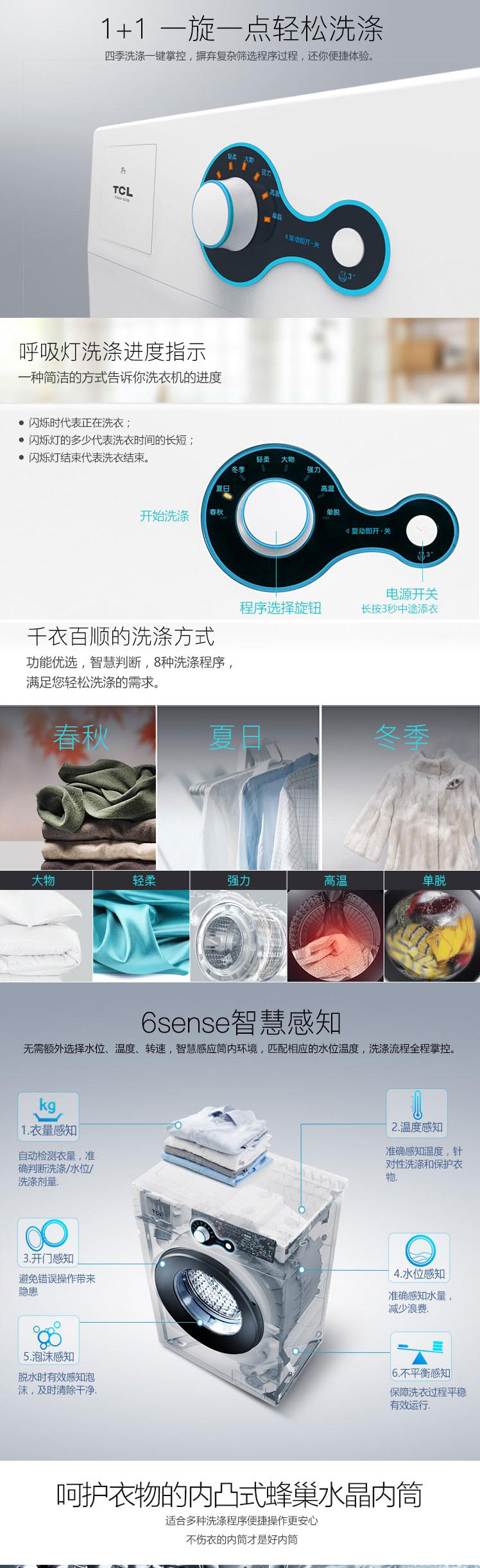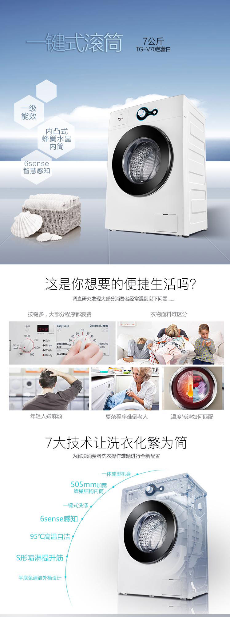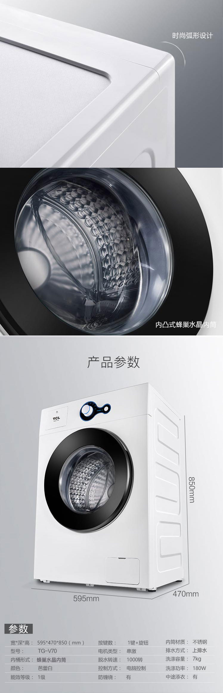 商品名称:TCL TG-V70芭蕾白7公斤 上排水 全自动 变频 滚筒洗衣机 一级能效高温自清洁 中途添衣一键操作