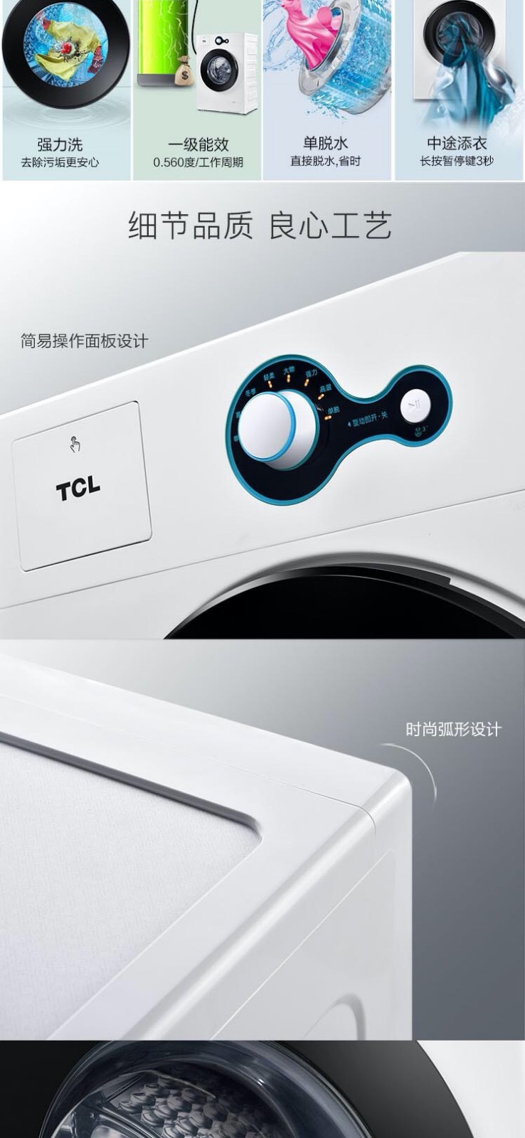 TCL TG-V80芭蕾白8公斤 上排水 全自动 变频 滚筒洗衣机 一级能效高温自清洁 中途添衣一键操作
