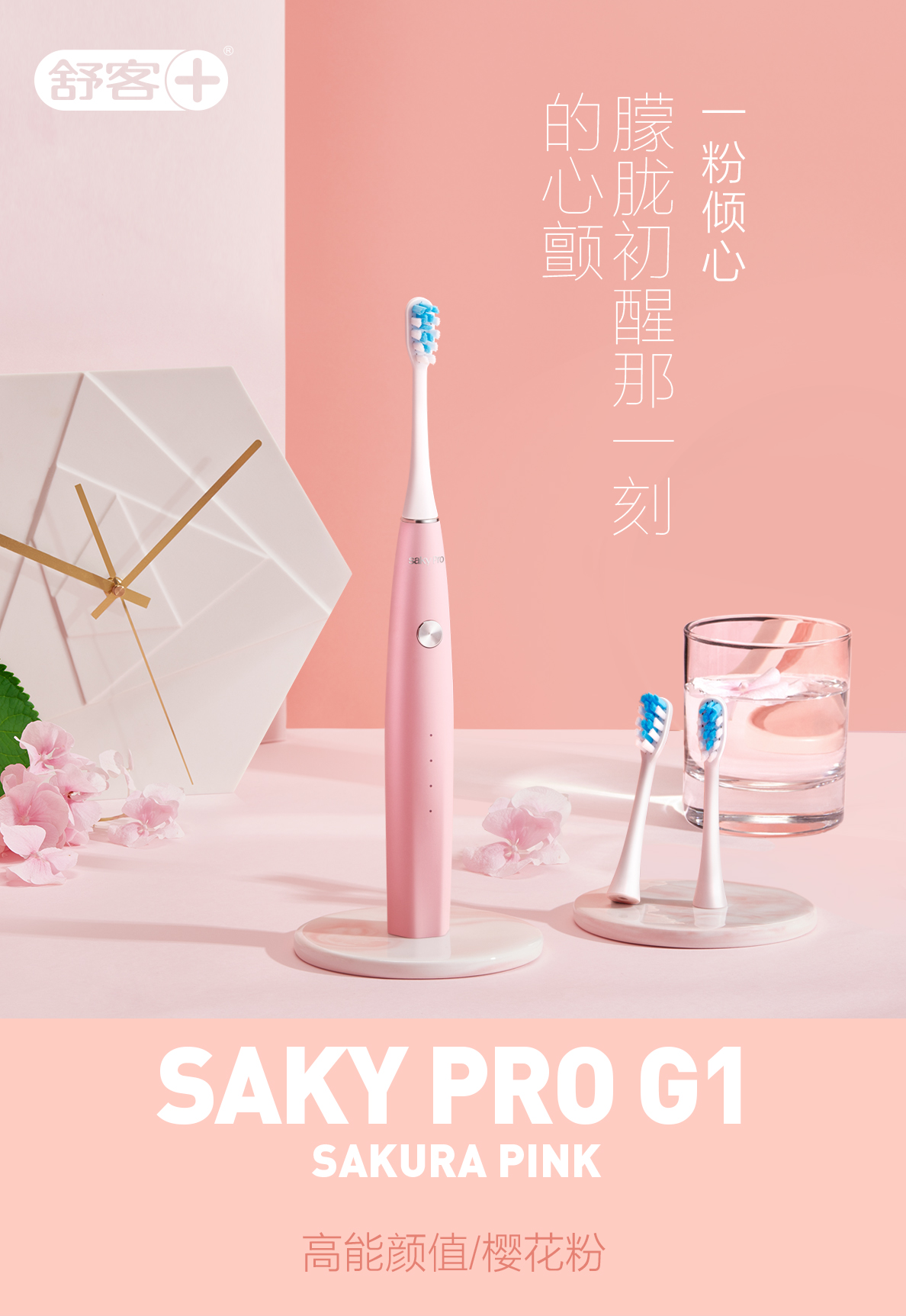 舒客 saky Pro声波电动牙刷N1-皓月白+樱花粉(颜色随机)