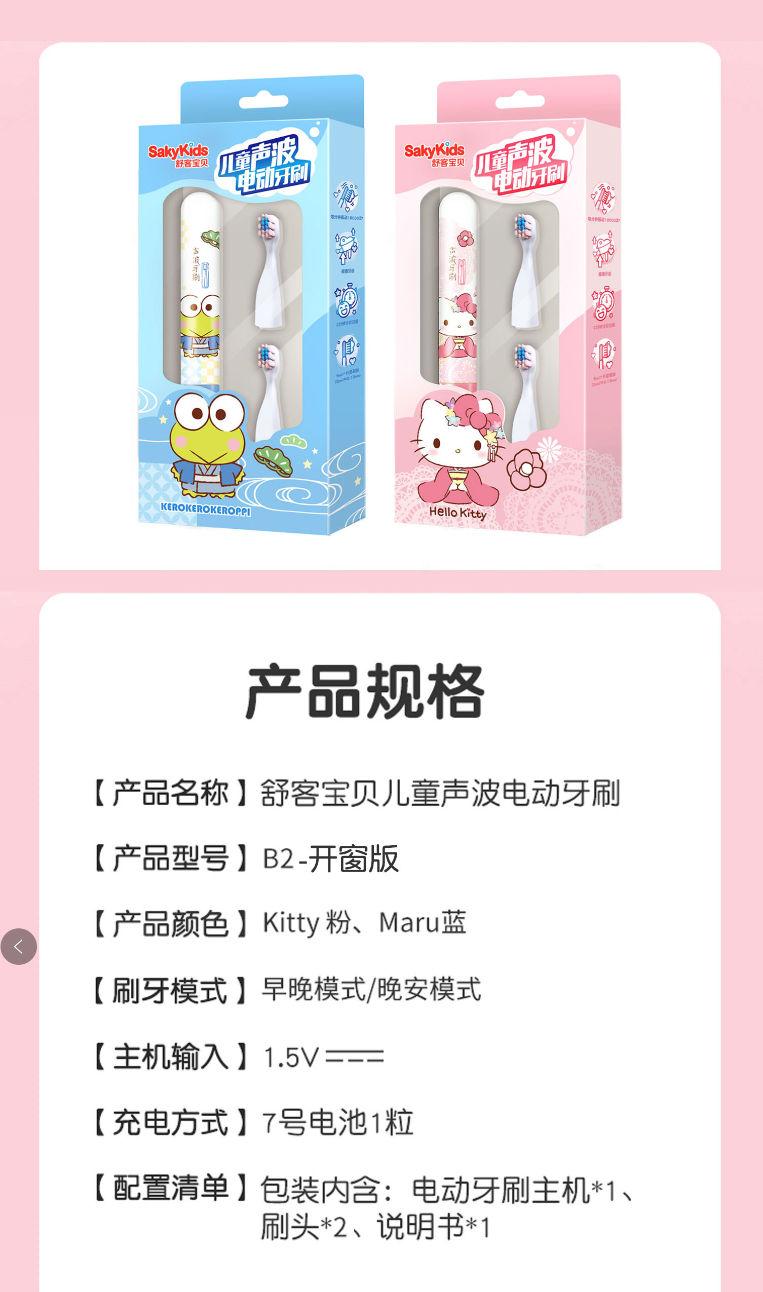商品名称:舒客宝贝儿童声波电动牙刷B2系列套装-开窗纸盒版